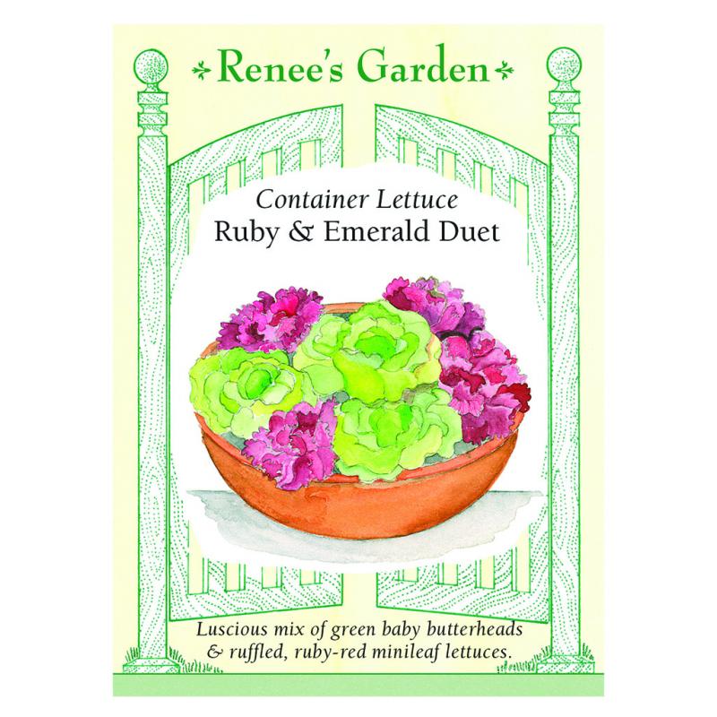 | They blend seeds for an emerald-green baby butterhead with softly folded leaf rosettes and a lovely, deep-red, ruffled, and crispy mini-leaf lettuce. This glowing duet makes a beautiful tapestry of contrasting colors, textures, and shapes. Both heat-tolerant varieties make compact 5 to 6-inch heads at maturity. A feast for the eye and delicious to eat over a long harvest period, this duet is as pretty as a picture in the garden or in big pots on a patio or deck. |
