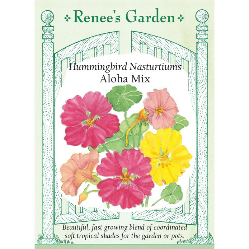 | (Tropaeolum majus) Aloha Mix is blend of soft tropical shades including apricot, cream, soft yellow and rose. These pretty blossoms atop lily pad-shaped leaves make a lovely garden tapestry. Aloha Mix grows readily in pots or window boxes, or plant in garden beds to softly drape and cover bare spots or fill in borders. Both flowers and leaves of nasturtiums are edible with a spicy flavor like watercress. They make tasty additions to salads or sandwiches. |