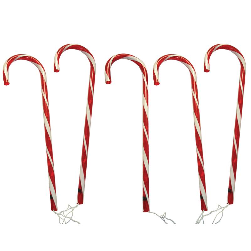 | The Candy Cane Pathway lights are a set of 5 - 28-inch tall red and white candy cane stakes with 50 clear incandescent lights. The total length is 10.3 feet, with a lighted length of 8 feet. The lead wire is 20 ", the spacing between the candy canes is 24 inches, and the end connector is 4". The lights are designed to create a pathway along the driveway, sidewalk, or lawn for indoor or outdoor use. |