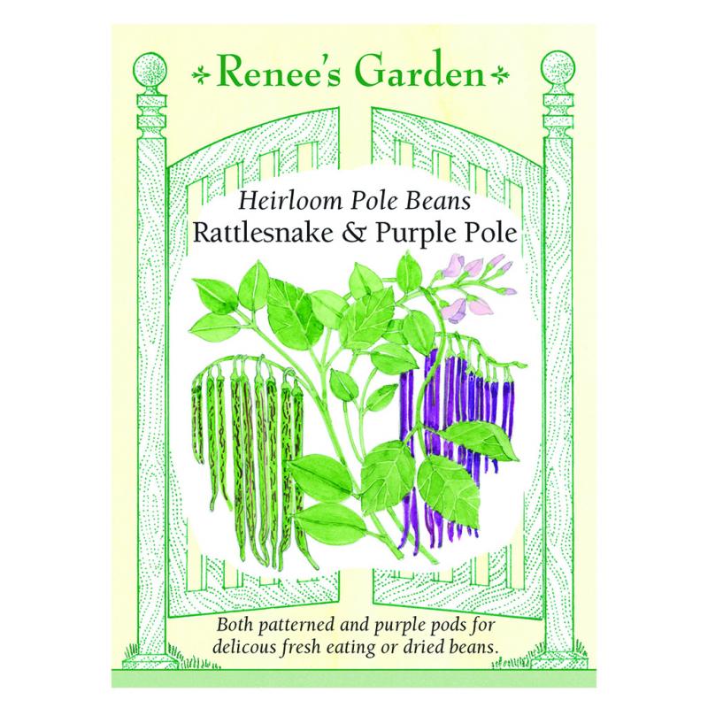 | The pretty patterned pods of Rattlesnake pole beans make delicious fresh snap beans. Or let the seeds mature and dry in the pods, then shell them for nutty-tasting and nutritious dried bean dishes. Distinctive purple pole beans are renowned for flavor and reliability, offering long, tender, crunchy pods whose rich color stands out from the vines so they are fun and easy to harvest. Both of these treasured heirloom beans have been passed down among generations of gardeners. |