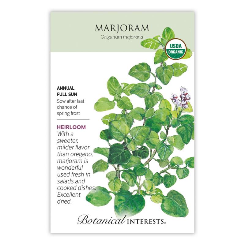 | Also called sweet marjoram, its flavor is considered milder but more complex than its relative, oregano. Some describe the flavor as having a hint of balsam. A very popular ingredient in German sausage and herb breads. Fun folklore: Legend has it that if you touch marjoram before bedtime, you will dream of your future spouse. Perennial in USDA zones 9 and 10; usually grown as an annual. Drought tolerant and deer resistant. |