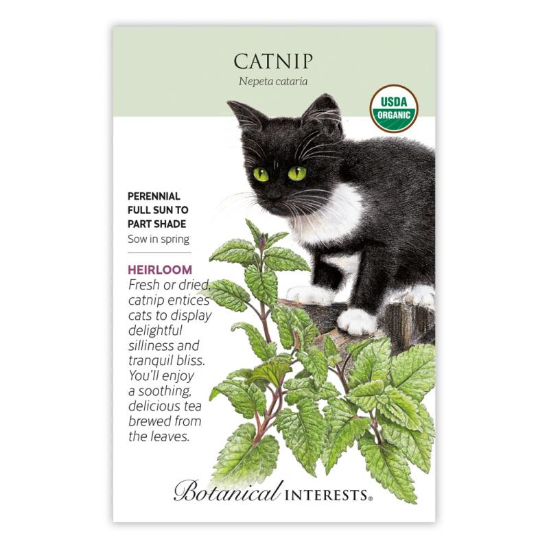 | Catnip is a multi-purpose plant. The tea is very pleasant with a lemon-mint flavor and fragrance. Along with fresh catnip planted in containers indoors year-round, catnip toys filled with dried leaves will provide your feline friends with hours of fun. But be warned; they may ignore you for a while! Catnip is very hardy and grows in almost any soil; self-sows readily. |