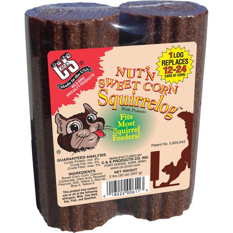 | Nut 'N Sweet Corn Squirrelogs are 100% consumable, more economical, easier to use and remain on the feeders resulting in more enjoyment! Refill pack for squirrel hangers and feeders with nails/spikes. Squirrelogs already have a nail/screw hole for easy refills. Contains sweet corn, corn, calcium carbonate, citric acid, salt and roasted peanuts. 2 logs. |