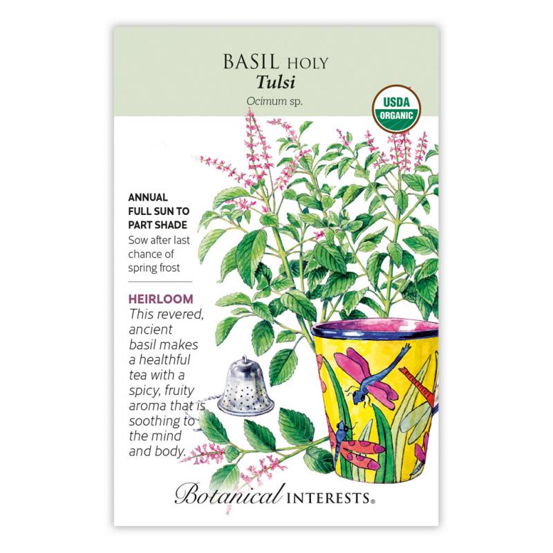 | Known as the Queen of Herbs in India, tulsi is considered to be sacred. This type of holy basil is also known as kapoor, or temperate basil. It is distinguished by its bubble-gum scent, frost-tolerance, and fast-growing nature. Its health-promoting properties are said to help combat stress and other medical concerns. If allowed to flower, it is a bee magnet and it may reseed. Grow indoors for a continuous supply of fresh leaves throughout the winter. |