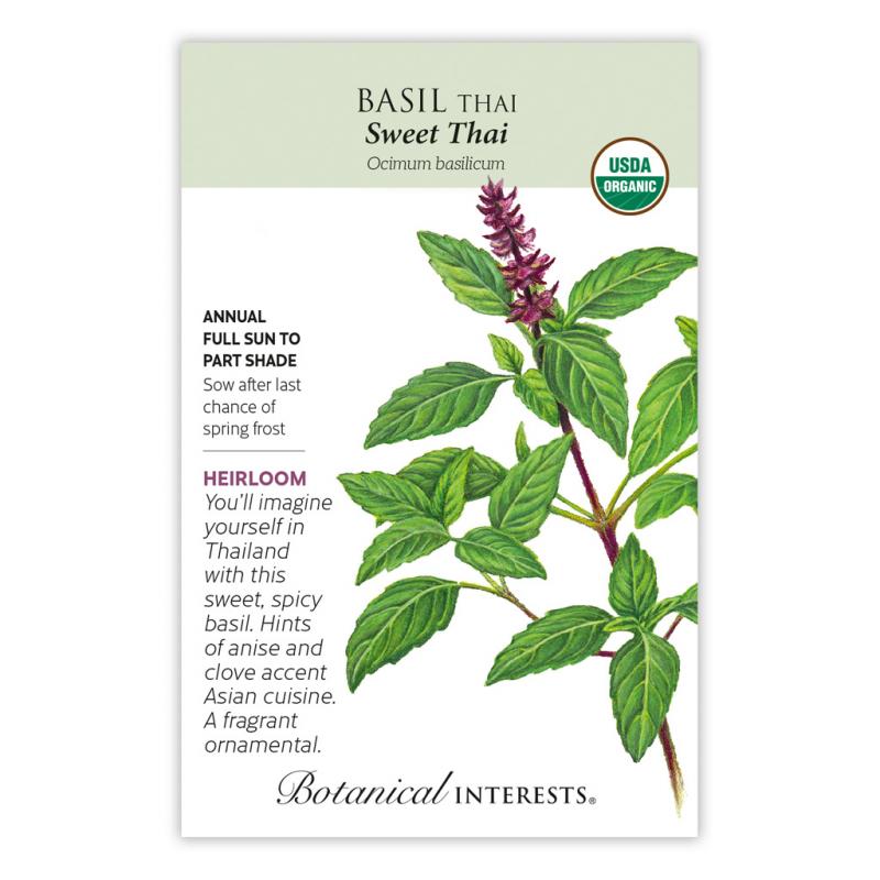| Thai basil is a popular herb in Southeast Asian cuisine and is a flavorful garnish served with Vietnamese pho (a savory broth of noodles and meat). It holds its flavor and texture better after cooking than other basil varieties and adds a kick to salads when sliced and eaten fresh. Sweet Thai's dark purple flowers and intoxicating scent make it a beautiful addition to the flower garden. A terrific container variety. |