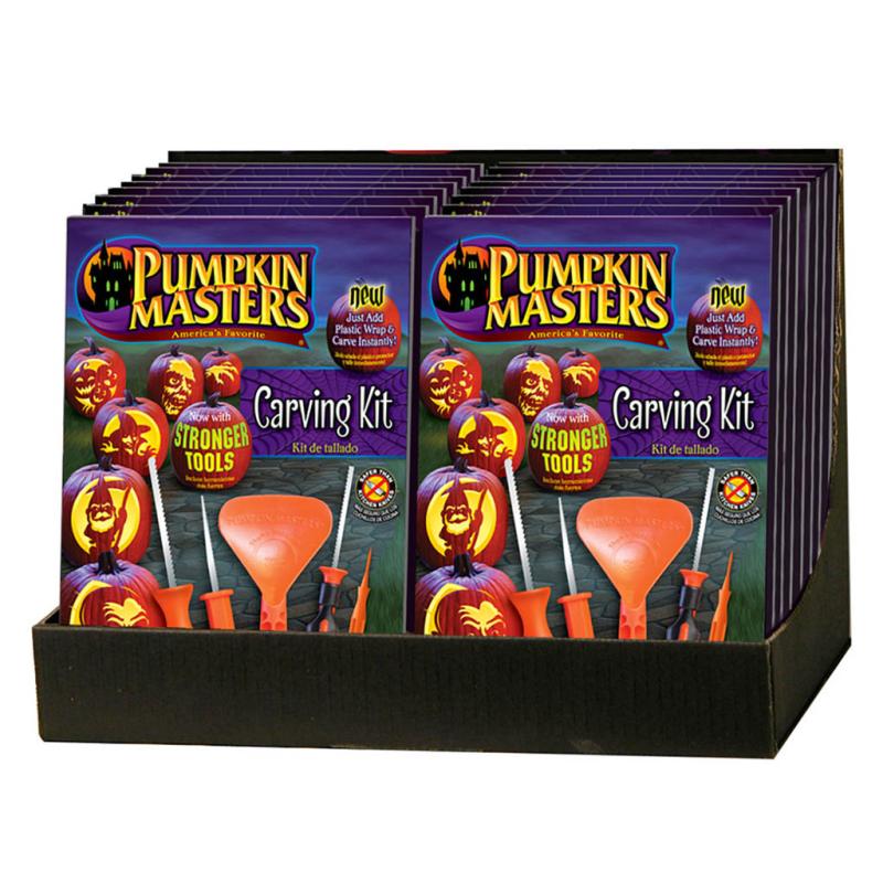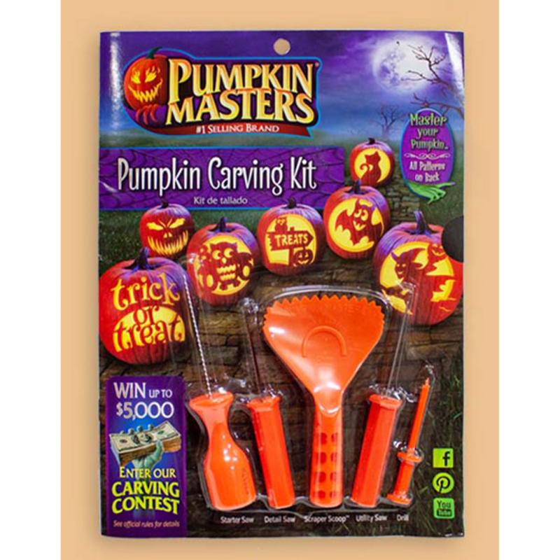| Pumpkin Masters #1 kid's carving kit with specially designed tools. It includes the kid-friendly DuraSaw, Scraper Scoop, quick pattern stencils, 4 pairs of eyes, and crayon. Great for ages 6+. |