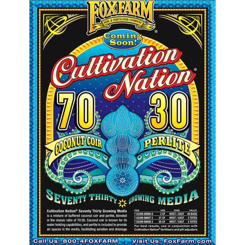 Description: 70% Coconut Coir / 30% Perlite. Cultivation Nation Seventy Thirty Growing Media is a mixture of buffered coconut coir and perlite, blended in the classic ratio of 70:30. Coconut coir is known for its water holding capabilities, and perlite is included to provide air spaces in the media, facilitating aeration and drainage. For best results, use in conjunction with FoxFarm Cultivation Nation fertilizers and pH adjusters. Cultivation Nation Seventy Thirty Growing Media is designed for use in containers in outdoor or indoor growing environments. Plant directly into this blend. When watering, add enough to fully saturate the media, allowing excess water to drain from the bottom of the container.