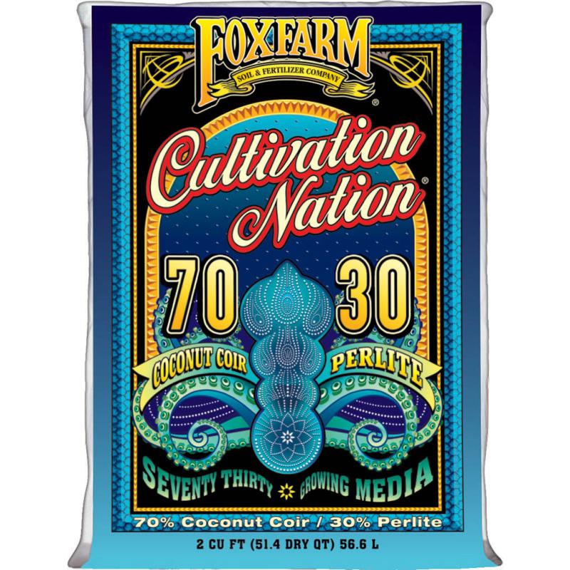 | 70% Coconut Coir / 30% Perlite. Cultivation Nation Seventy Thirty Growing Media is a mixture of buffered coconut coir and perlite, blended in the classic ratio of 70:30. Coconut coir is known for its water holding capabilities, and perlite is included to provide air spaces in the media, facilitating aeration and drainage. For best results, use in conjunction with FoxFarm Cultivation Nation fertilizers and pH adjusters. Cultivation Nation Seventy Thirty Growing Media is designed for use in containers in outdoor or indoor growing environments. Plant directly into this blend. When watering, add enough to fully saturate the media, allowing excess water to drain from the bottom of the container. |