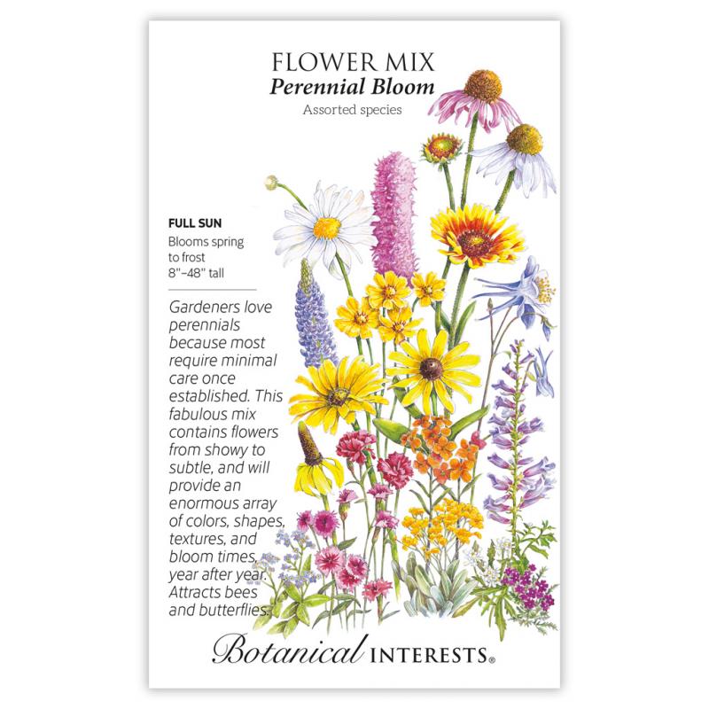 | Gardeners love perennials because they provide gorgeous color, shapes and sizes for years of enjoyment. You too can create the lovely flowerbeds that you've seen on the glossy pages of catalogues and garden magazines. It will be a joy to watch your garden "spring to life" each season. We've designed this mix to take the guesswork out of planning a perennial garden. You'll be delighted with the successive show of blooms from this packet that will last from spring into fall. A perennial garden has the added bonus of providing nectar for bees, food for birds, and winter interest if the plants are left standing. These seed packs cannot be sold in Wisconsin as per state regulations. Mix includes (see diagram): Basket of Gold Alyssum Black-Eyed Susan Blanketflower Candytuft Double Carnation McKana Columbine Pink Coneflower White Coneflower Lance-Leaved Coreopsis Spring Beauty Dianthus Alaska Shasta Daisy Woodland Forget-Me-Not Gayfeather Bigleaf Lupine Mexican Hat Moss Verbena Oxeye Sunflower Rocky Mountain Penstemon Siberian Wallflower |