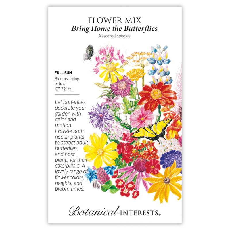 | It's easy to convert your garden into a private retreat for butterflies with this mix of annual, biennial, and perennial flowers and herbs! A lovely range of flower colors, heights, and bloom times. Mix includes (see diagram): China Aster Bishops Flower Black-Eyed Susan Borage Calendula Balsam Clover, Crimson Coreopsis, Lance-leaved Bachelor's button Cosmos Dill Lemon Mint Dwarf Lupine Mexican Sunflower Parsley Pincushion Flower Blazing Star Purple Coneflower Rocky Mountain Bee Plant Snapdragon Sneezeweed Butterfly Flower/Milkweed Sweet Sultan Sweet William Tall Verbena Sweet Alyssum Sulphur Cosmos |