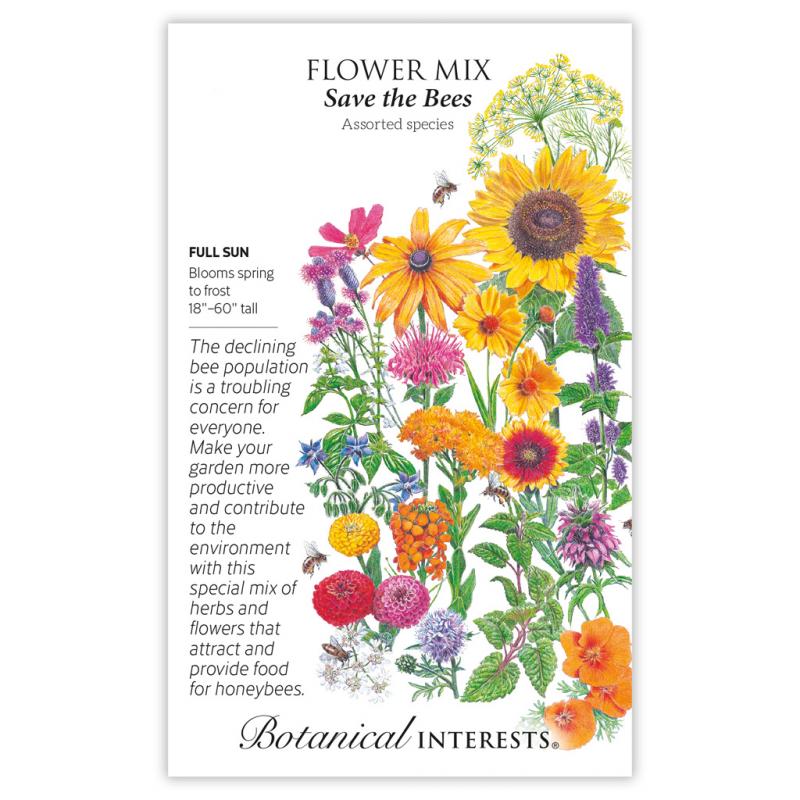 | The flowering plants in this mix provide food for many of the over 4000 bee species in North America. With so many gorgeous flowers and tasty herbs you'll appreciate this bountiful mix as much as the bees! Mix includes (see diagram): Sweet Basil Bergamot Black-Eyed Susan Borage California Poppy Catnip Cilantro/Coriander Coreopsis, Lance-leaved Cosmos Dill Annual Gaillardia Globe Gilia Rigid Goldenrod Lavender Hyssop Lemon Mint Purple Prairie Clover Siberian Wallflower Sunflower Cut and Come Again Zinnia |