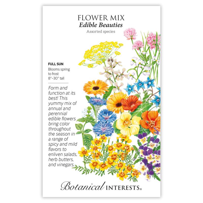 | More than just good looks, this annual and perennial mix is completely edible! In bright colors of orange, blue, yellow, and pink, you'll not only enjoy their color all season, but also the many ways you can use them. Savor the range of flavors, from peppery calendula and arugula, to clove-like bachelor's button, and the light onion flavor of chives. Add to salads, soups, and cooked dishes, and make herb butter, vinegars, and flavored drinks. The culinary possibilities are endless! Mix includes (see diagram): Arugula Bachelor's Button Basil Borage Calendula Chives Fennel Johnny-Jump-Up Nasturtium Radish Signet Marigold |