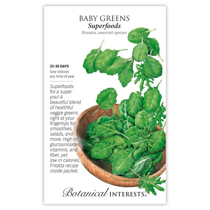 | What's more healthful than superfoods, such as kale, broccoli, and collard greens? Baby superfoods! Superfoods are known to pack nutrients and vitamins in every bite, and this blend delivers. Superfoods baby greens can be grown indoors at any time of year and are a nutrient-packed way to get your "green fix" in the dead of winter. Move containers as needed for best light exposure and temperature. Harvest when 2"–4" tall and enjoy! Mix includes: 20% kale, 20% broccoli, 15% collards, 15% kohlrabi, 15% turnip, and 15% bok choy |