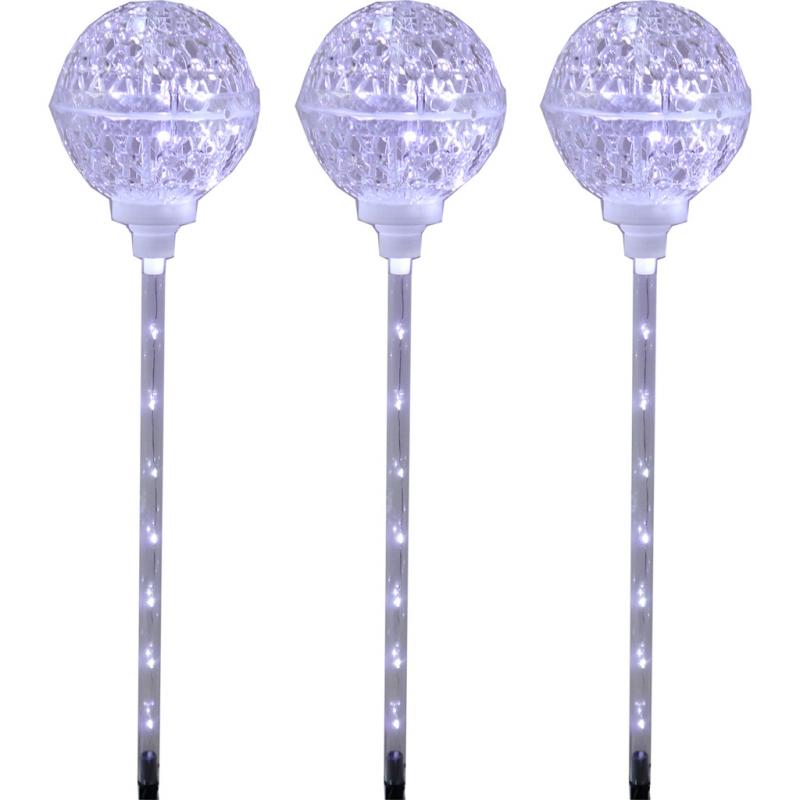 | Hollow globe pathway lights/markers. There are 4- 90 cool white LED Fairy lights globes and lighted stakes. Twenty percent of the LED lights twinkle in cool white. They have a 72" lighted wire length with 24" spacing and a UL adapter. The stakes and globes stand 32 inches tall. |