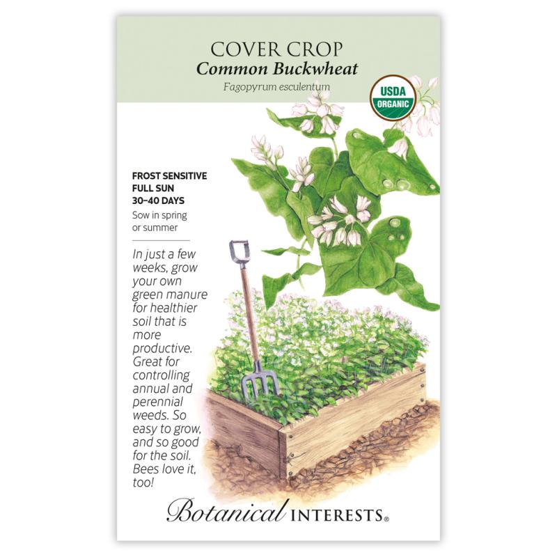 | Buckwheat has been used for centuries to improve soil health and smother common weeds. It grows better than most cover crops in poor soils and is better at retrieving phosphorus, a macro-nutrient that contributes to later crops' root, flower, and fruit growth. Buckwheat not only grows quickly, it also breaks down quickly in the soil, allowing for planting in the same area just 3 to 4 weeks after incorporating it into the soil. It can also be used as mulch on the soil surface. If allowed, white flowers will form about 35 days after sowing and are loved by beneficial insects and even make pretty filler in bouquets! Turn buckwheat into soil before seeds begin forming. Because buckwheat is cold sensitive, it is grown spring to fall frost, except in mild climates that may be warm enough to grow into fall and possibly winter. |