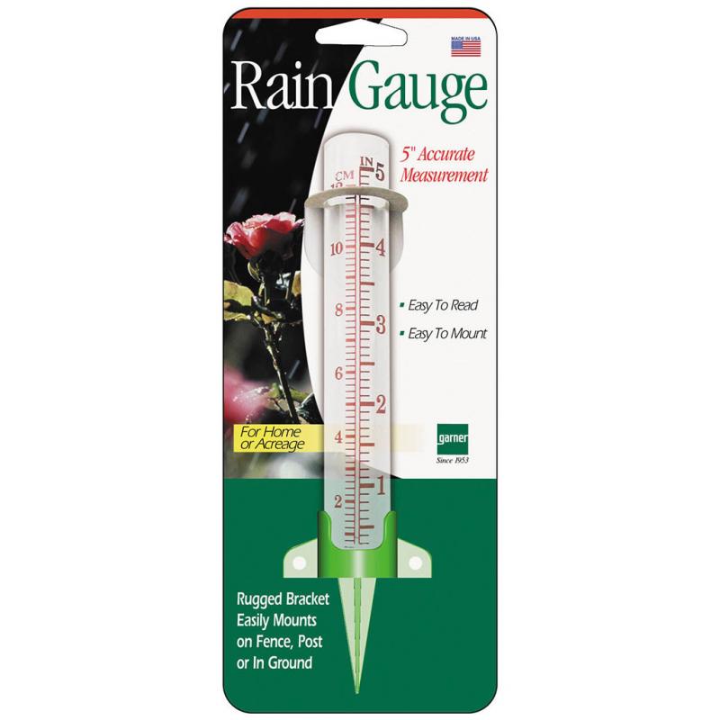 Small glass vile rain gauge that mounts or stakes into the ground. Magnifies water level markings when filled with water.