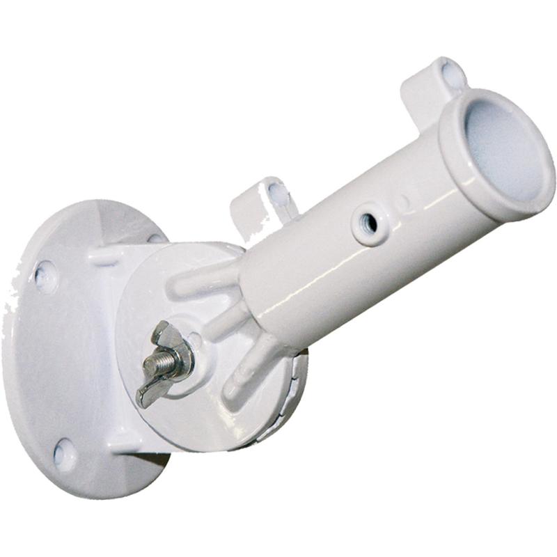 | This aluminum flag pole bracket is made to fit standard decorative house flag poles with 1" diameter. This metal pole bracket has a white powder coat finish to help blend with the trim of your home. |