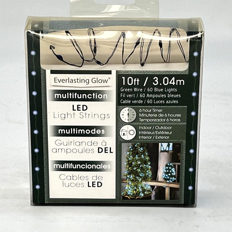| This battery-operated micro-string light set is 10" and features 60 Blue LED Lights with green micro-thin wire. It has three functions: wave, slow fade, and steady on. It has an automatic timer that goes on for 6 hours and then off for 18 hours. It requires 3 AA batteries. |