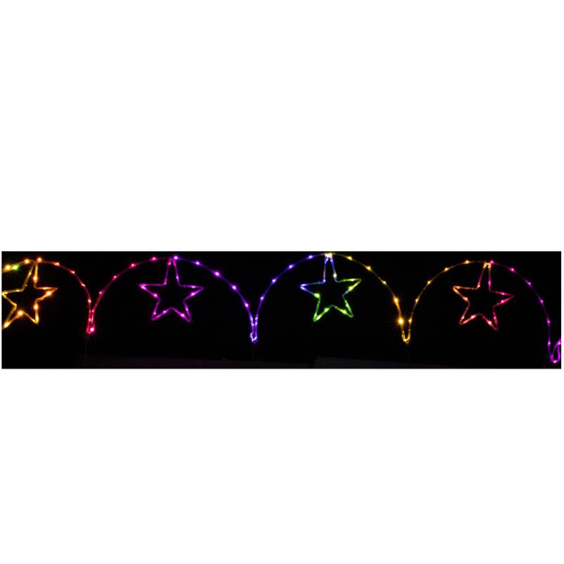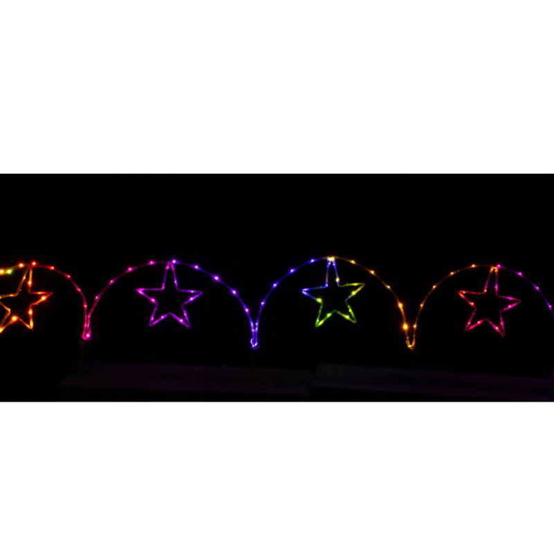 | This Pathway Arch has a Video function tape. It is a multi-colored, lighted pathway arch with star accents. The LED tape light with a video chip has millions of lighting possibilities. The five pieces per set are 10 feet in total length. It includes a remote control and ground stakes and has a UL-listed adapter plug. |
