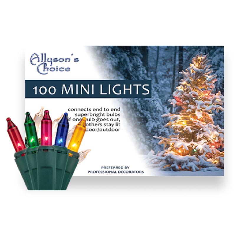 | All Alyson Choice light sets are UL-approved. This set has 100 multi-incandescent lights with a 1200- 1500-hour bulb life and 2.75-inch spacing. The bulbs are 170 ma and 2.5V, which are considered extra bright. The total length is 23 feet, and the green cord has an end-to-end connector. The lead length is 12 inches, and the tail length is 3.5 inches. You can put up to 5 sets together for indoor or outdoor use. |