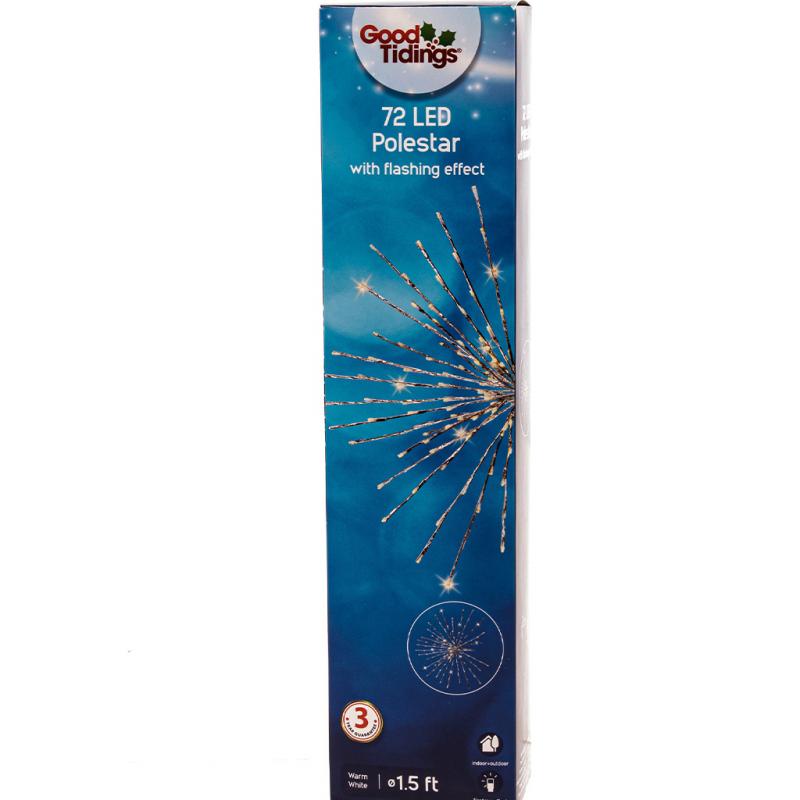 | LED polestar with flashing lights. For outdoor use only. Lead cable: 16.5', UL approved IP44 transformer. Non replaceable bulbs. Silver tape and flashing bulbs. Silver/Warm White |