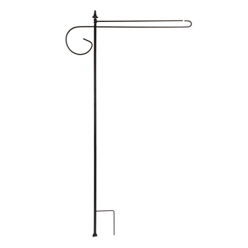 This three-piece wrought iron house flag stand measures 62"Tall. The arm extends 35" from the post and attaches easily using the included wing screws. This house flag stand is made to fit house flags that are up to 29" wide.