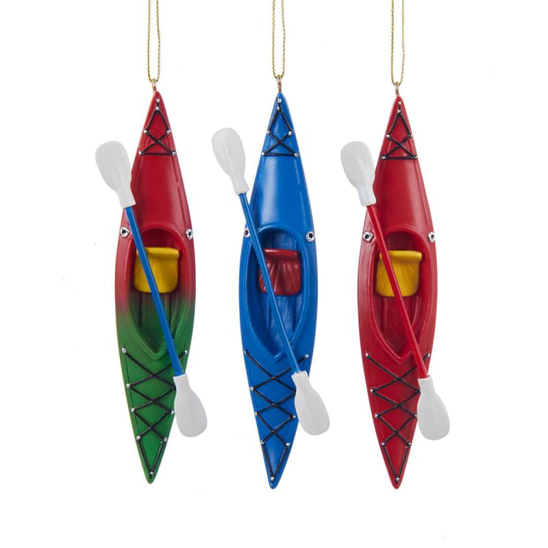 Get ready to ride the toughest currents with our kayak with oar ornaments from Kurt Adler! These ornaments are featured in three styles: red, blue, and green/red. Each kayak is accompanied by oars.