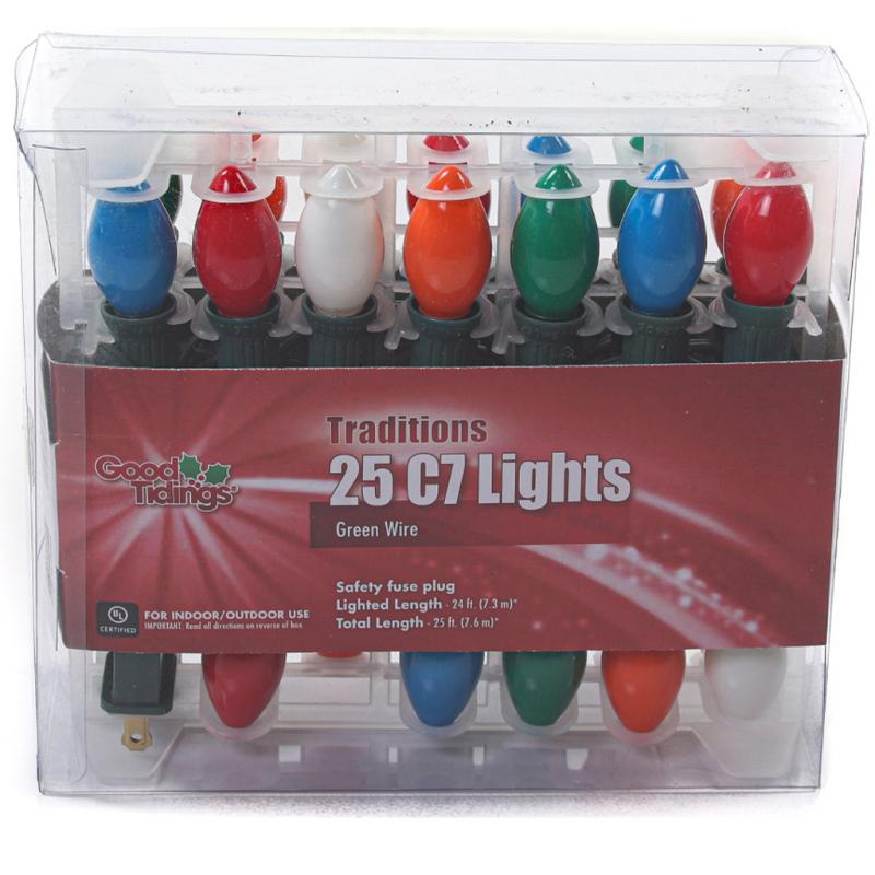 | These traditional C7 light bulbs will add Christmas cheer to any decoration. This 24' lighted length set has ceramic multi colored glass bulbs. Connect sets end to end for lots of holiday cheer. 12" spacing between bulbs and 6" to end plug. Green wire. |