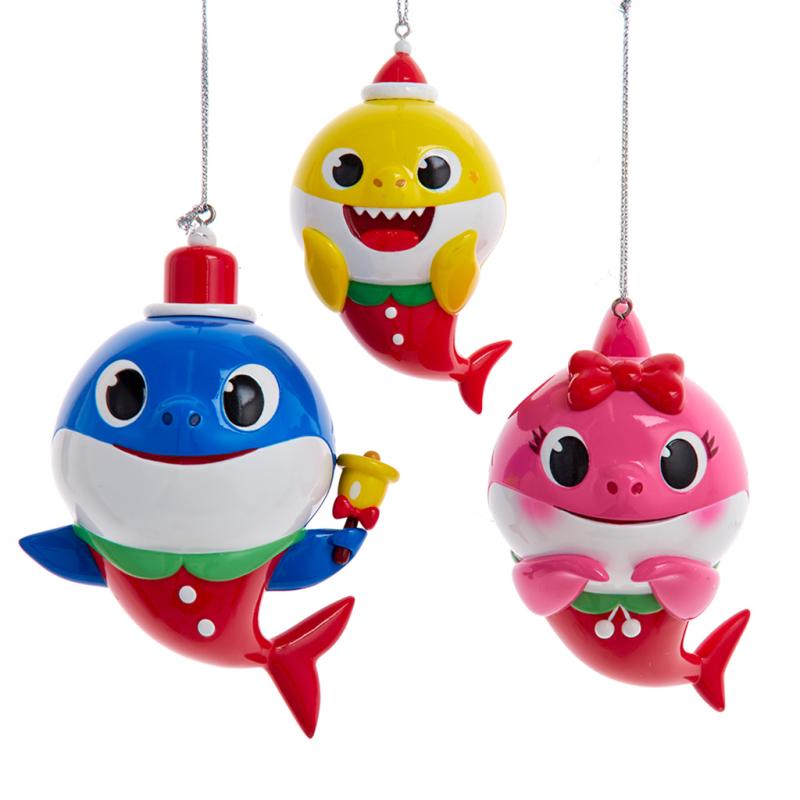 | These Baby Shark™ ornaments are a fun and festive addition to any holiday décor or Christmas tree. This assortment features a blue, pink and yellow shark, each are wearing a red and white Santa hat. |