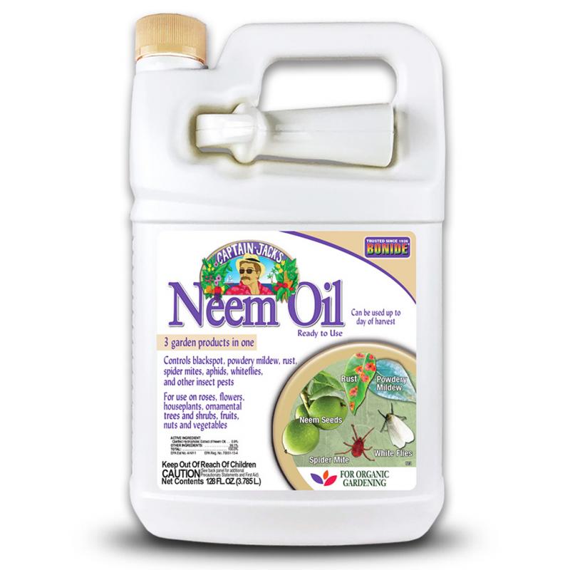 | Protect your lawn and garden with Neem Oil from Captain Jack's. The active ingredient, clarified hydrophobic extract of neem oil, is an effective multi-purpose fungicide, insecticide, and miticide. Captain Jack's Neem Oil Ready-to-Use Spray is approved for organic gardening and can be used up to the day of harvest. It is used on various plants in your lawn and garden, including roses, flowers, houseplants, ornamental trees and shrubs, fruits, nuts, and vegetables. This product controls listed insects by killing the egg, larvae, and adult stages—controls listed insects, including spider mites, aphids, whiteflies, and more. With neem oil, prevent and control diseases like powdery mildew, blackspot, rust and more. This product arrives conveniently ready-to-use with an attached trigger sprayer. For best results, shake well and apply to affected plants until the point of runoff. Reapply every 7-14 days as needed. For full-use instructions, please take a look at the product label. |