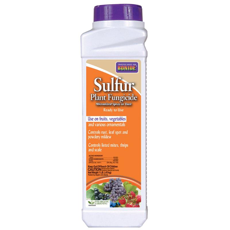 | Bonide® Sulfur Plant Fungicide Dust – 1 lb. It’s formulated with 90% sulfur; this micronized sulfur dust can be applied as dust or mixed for spray use. Its fine particle size ensures superior coverage, adhesion, and disease control on fruits, vegetables, and ornamentals. Helps manage a wide range of plant diseases and is approved for organic gardening. Now also labeled for chigger control. |