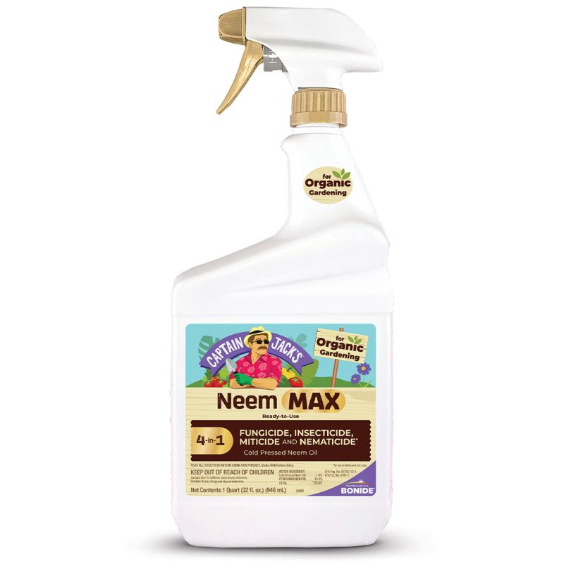 Bonide® Captain Jack's™ Neem Max is an all-purpose, ready-to-use spray that employs multiple modes of action and acts as 4 garden products in 1. Cold-pressed Neem Oil is a plant-based active ingredient that is effective in preventing and controlling diseases and pests in your organic garden. Active ingredient: Cold-pressed Neem Oil 70% |