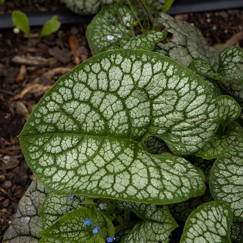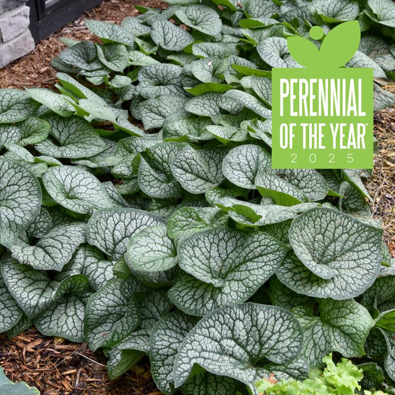 | 2025 Proven Winners National Perennial of the Year® This shade perennial can best be described as a giant version of the classic 'Jack Frost'-with a twist. The huge 9-10" leaves overlap dramatically at the base, giving them a shape similar to the snail delicacy escargot. Overall, the foliage is circular from a distance. The leaves have a heavy silver overlay with a vivid, broad, dark green veining pattern. From mid to late spring, baby blue, forget-me-not-type blossoms are held in clusters above the foliage. Brunneras are classic perennials treasured for their shade tolerance and lovely blooms. They make a fantastic groundcover, though the variegated forms may be slower to spread than the species. Try growing them in containers, too, so they will be close at hand when you want to snip a few blooms for a spring bouquet. |