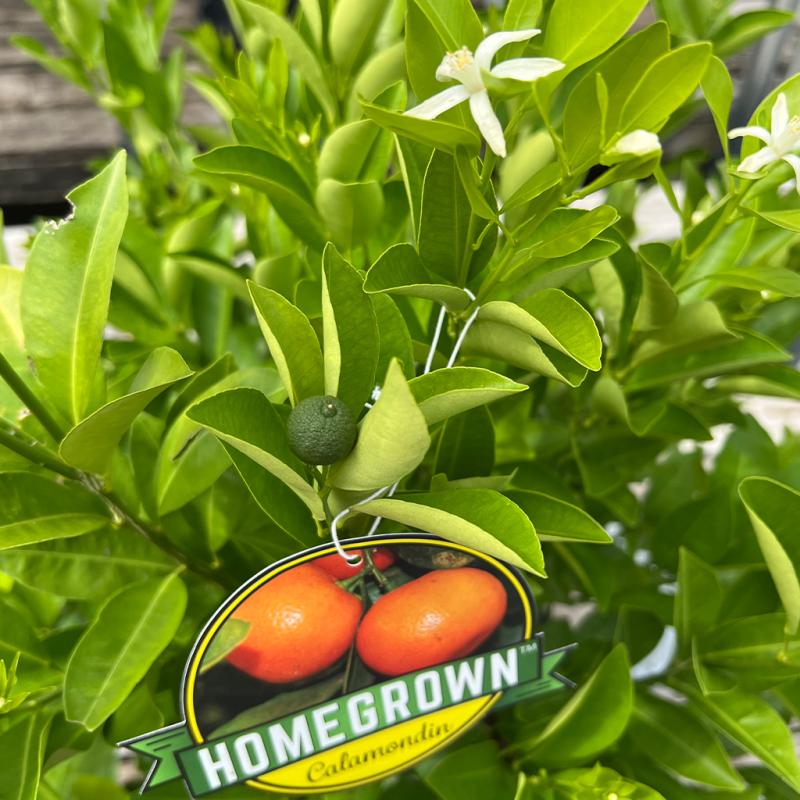 | Most often grown as beautiful ornaments, the Calamondin Orange Tree, sometimes known as Calamonsi or Miniature Orange, also produces edible fruit. It is a cross between mandarin orange and kumquat, originally from China. It has been grown in Florida since the early 1900s and has been a popular potted plant for decades. This fruit tree is also known for being used for bonsai. This is the perfect plant to accent your patio or sunroom—with the bonus of citrus fruit. Enjoy attractive green leaves, beautiful white blossoms, and orange-scented flowers. The Calamondin oranges are vibrant yellow oranges; the tree can produce fruit year-round. Potted Calamondin trees should be brought indoors during winter months. | |