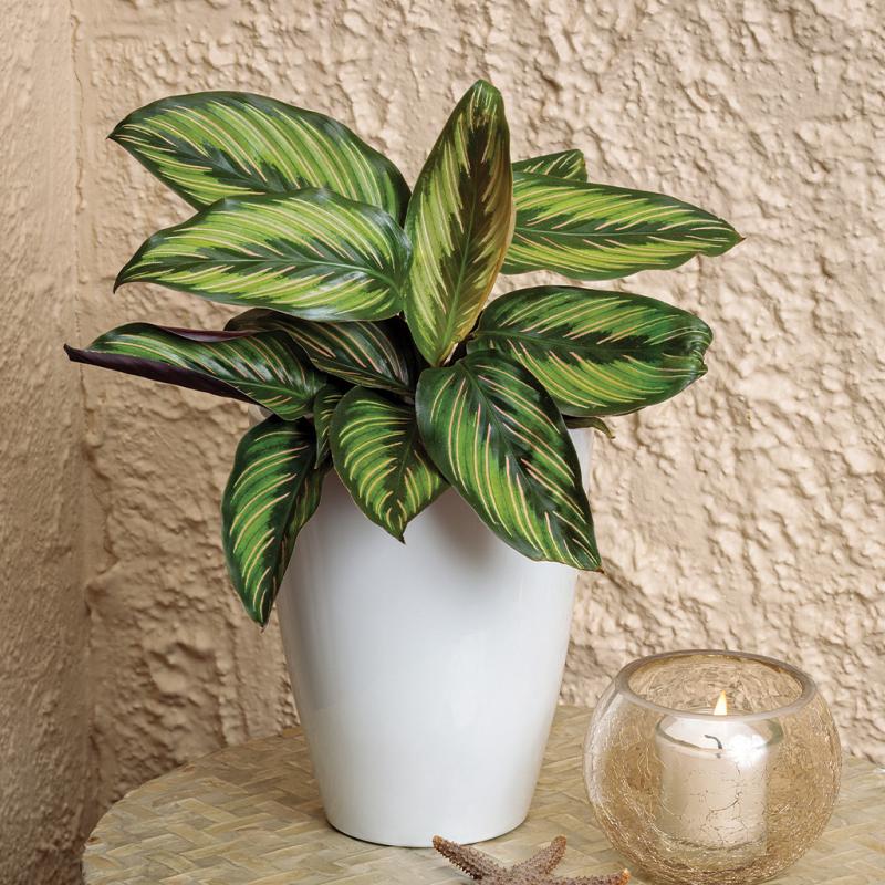 | Beauty Star is a prayer plant, the common name for plants that tend to fold their foliage as night falls. Prayer plants include plants in the following genera: Calathea, Maranta, Stromanthe, and Ctenanthe. Calathea are grown for their beautifully ornamental leaves. Beauty Star's foliage has a deep green midrib and leaf edge, which provides a gorgeous contrast to the lighter green in between. And with the thin, white, artistic stripes, it's a keeper! The underside of each leaf is burgundy purple. Calathea ornata has been reclassified as Goeppertia ornata. | |
