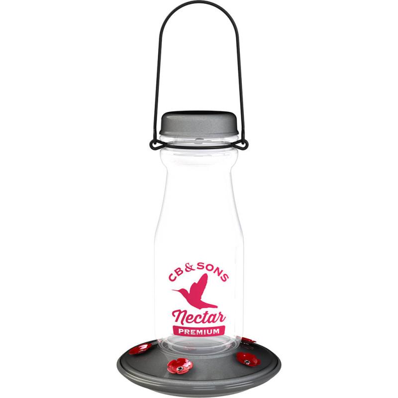 | More Birds Jersey Hummingbird Feeder has a beautiful glass vintage milk bottle design and sturdy metal base with 5 ports. Logo screen printed on the bottle for a real retro feel. Has a silver finish on cap and basin. Base disassembles for easy cleaning. |