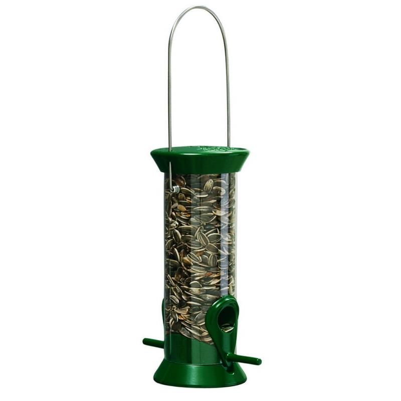 | Sturdy metal parts and long lasting UV-stabilized polycarbonate tubes. Durable powder coating. Zinc die-cast tops, bases and ports last a lifetime. Stainless steel hanging wire - squirrels can’t chew. Snug fitting sliding cap - easy for you to lift but hard for squirrels. Top easily removes for easy cleaning. Seeds flow freely over internal seed baffle. Threaded base allows for use with Droll Yankees accessories. Lifetime warranty against squirrel damage. Made in the U.S.A. |