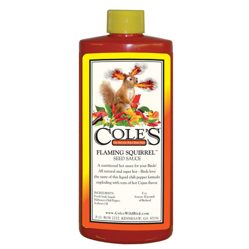 | Flaming Squirrel Seed Sauce™ is a nutritional birdseed supplement that contains all natural, 100% food grade ingredients with a super-hot and spicy flavor. Birds love the taste of this liquid chili pepper formula exploding with tons of Cajun spice. When mixed with your favorite birdseed, it’s guaranteed to increase bird visits at your feeder. Ingredients: Food grade liquid habanero chili pepper and soybean oil. |