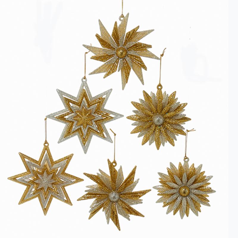 Description: Add some sparkle to any holiday décor or Christmas tree with these gold and silver sunflower and snowflake ornaments by Kurt Adler. Each ornament features a shimmery glitter design. This gold and silver assortment includes a sunflower, pinwheel snowflake, and star snowflake design.