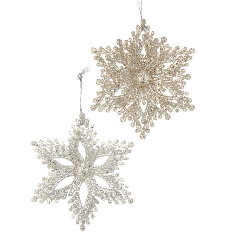 | Add some sparkle to any holiday décor or Christmas tree with these platinum glitter snowflake ornaments from Kurt Adler. This assortment features a snowflake with light platinum and dark platinum designs. Each ornament is shown in a glittered design. |