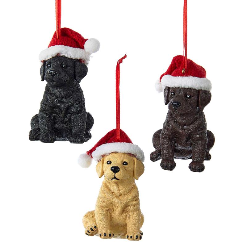 | These Kurt Adler Labrador Retriever with Christmas hat ornament are an adorable addition to any holiday décor or Christmas tree. These ornaments feature three Labrador Retrievers with festive Christmas hats on. This assortment includes a Black Labrador, a Yellow Labrador, and a Chocolate Labrador. |