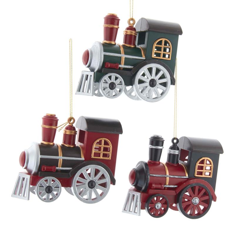 | Kurt Adler's red, black, and green locomotive train ornaments are a charming addition to your home or holiday décor. This assortment features a color scheme of red, black, and green with silver and black wheels. |