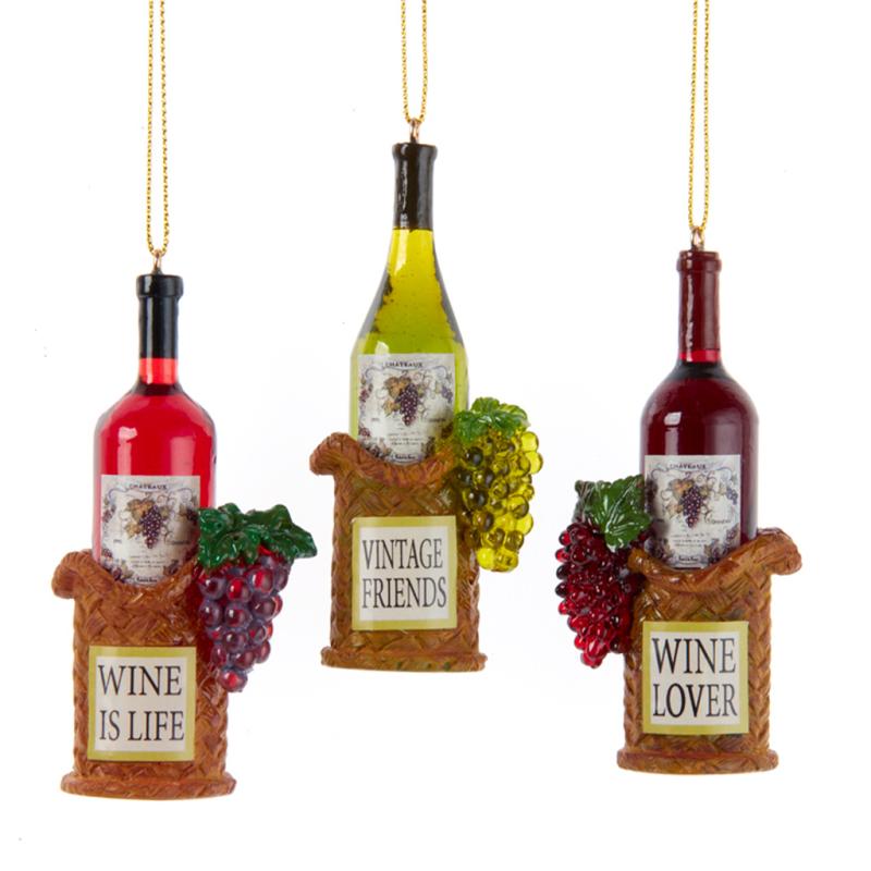 These Kurt Adler, wine bottle ornaments, are a fun and festive addition to any holiday décor or Christmas tree. This assortment includes the sayings "Wine Is Life," "Vintage Friends," and "Wine Lover."