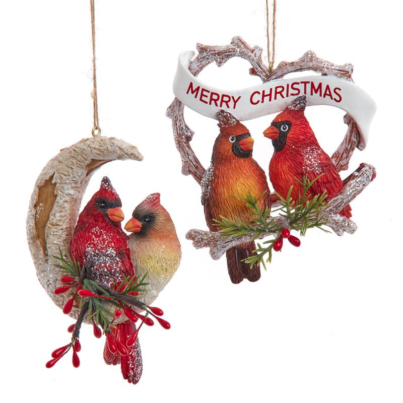 | Kurt Adler's cardinal pair ornaments are a fun and festive addition to any holiday décor or Christmas tree. This assortment features a cardinal pain sitting on a crescent moon and a cardinal pair sitting on a branch with a heart-shaped frame. |