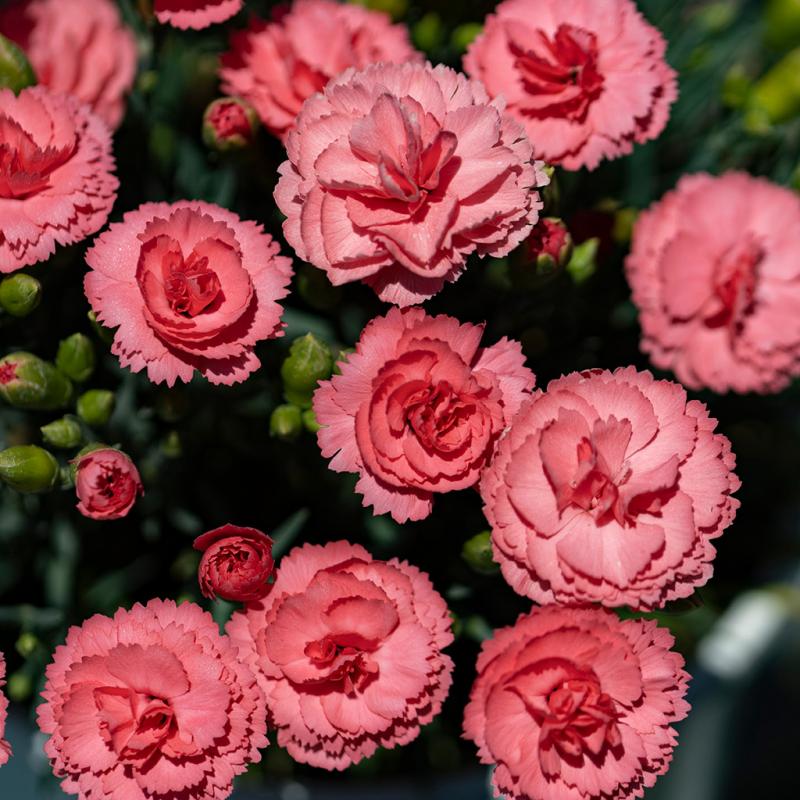 | 'Classic Coral' is the long-awaited missing color of the FRUIT PUNCH® series. A splash of double, striking coral-pink flowers is produced in early summer over a tight, compact mound of blue-green foliage. Members of the Dianthus FRUIT PUNCH® series share the following traits: semi- to fully double, fragrant flowers, and good heat and humidity tolerance. Flowers appear in early summer, and a quick shearing after flowering encourages them to rebloom in early fall. FRUIT PUNCH® Dianthus is just the right size to edge the front of the sunny border and use in combination containers. In the carnation family, Dianthus cultivars deliver gorgeous single, semi-double, and fully double flowers. Singles give more flowers, while doubles are more significant, sometimes more than twice the size. Singles also tend to move quickly and can appear like a carpet in the landscape at maturity. |