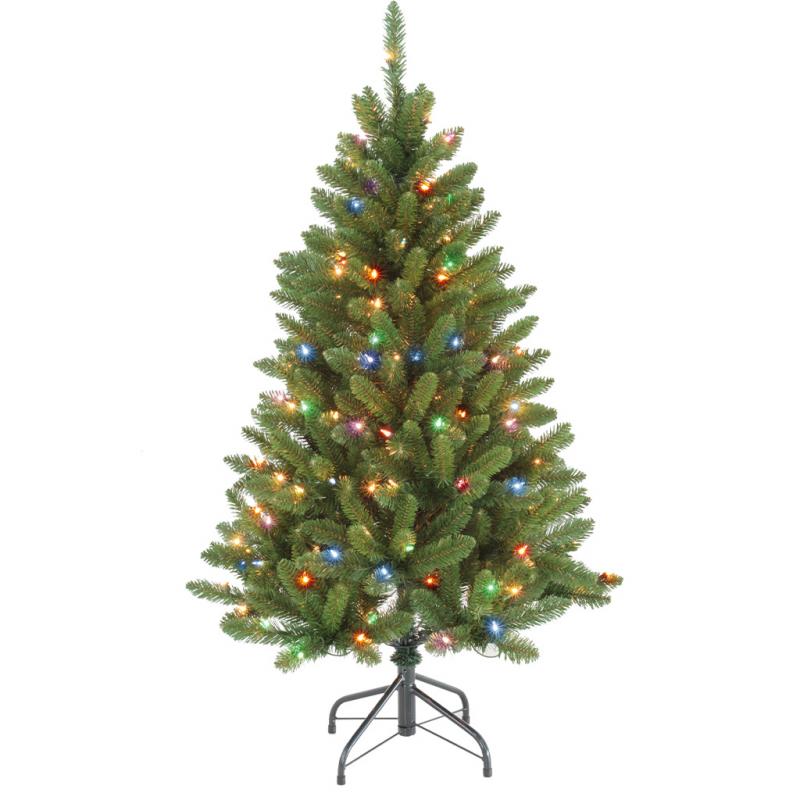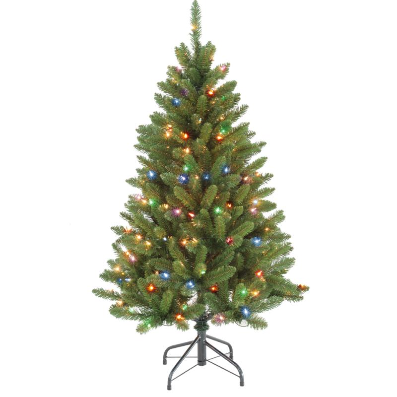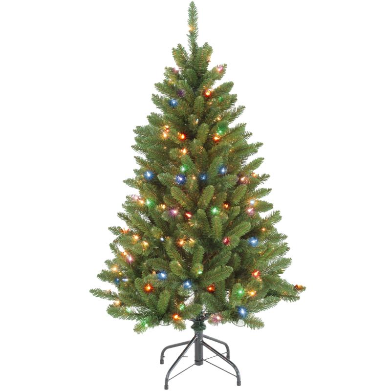 The full PVC tree stands 4 feet tall and has a hinged construction for easy setup. It is pre-lit with either clear or multicolor lights. Size/Base: 4' H / 32" Dia. Tips: 389 Lights: 200 Multi
