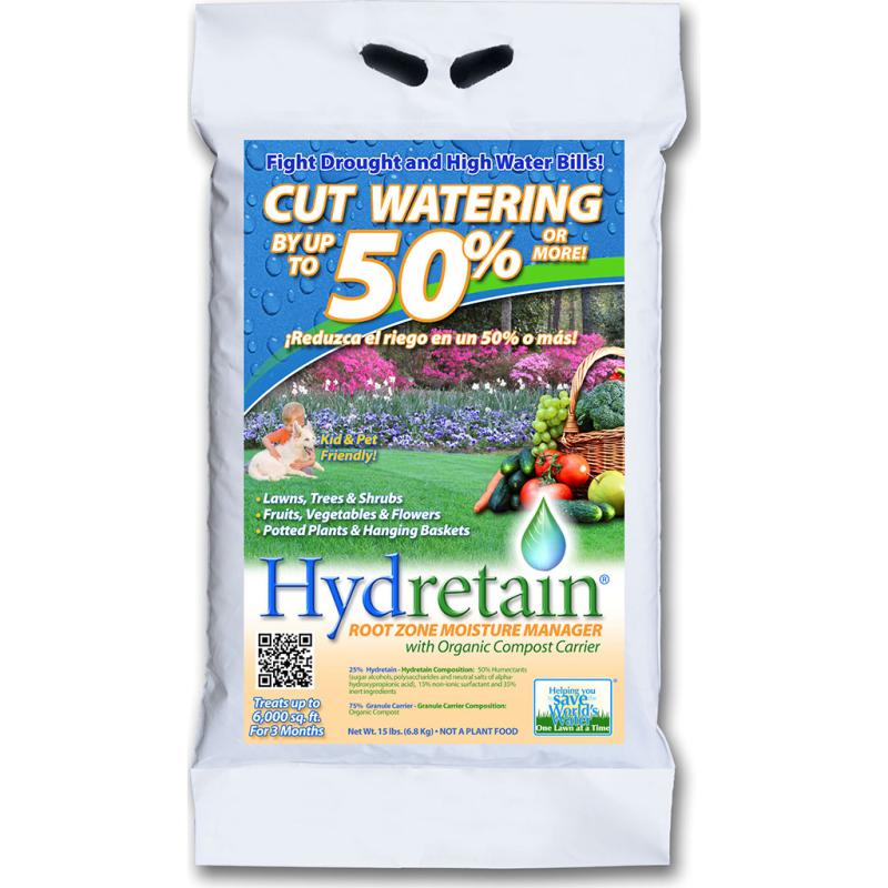 | Unique root zone moisture manager that effectively reduces the overall watering requirements of lawns, shrubs, trees, flowers, fruits and vegetables by as much as 50% or even more. Hydretain is not a wetting agent or a polymer gel. It is a blend of hygroscopic and humectant compounds that convert moisture vapor in the soil into water droplets that plants can use. This process improves water and nutrient uptake to help plants thrive, even under heat and drought stress. Hydretain Granular is on an organic compost carrier, which can be spread, broadcast or topdressed. 3 lb. bag covers up to 1,000 sq. ft. of lawn and 300 sq. ft. of garden. Perfect for potted plants, hanging baskets, and flower and veggie gardens. Kid and pet friendly, and easy to apply. |