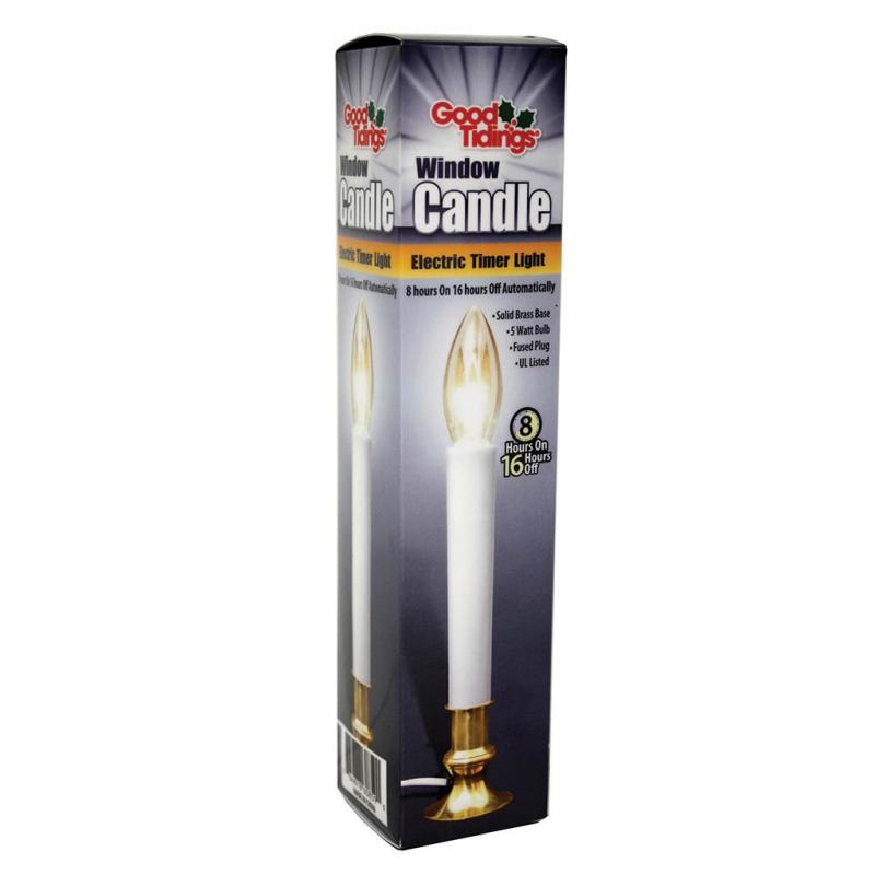 Electric Window Candle operates for 8 hours on and 16 hours off automatically. White plastic candle on a solid brass base. Plug in to activate, unplug to reset timer. 5W bulb included. Fused plug, UL listed.