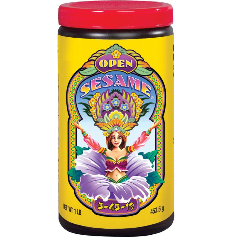 | For Early Flowering Stage. 5-45-19. Open Sesame is a high-phosphorus soluble fertilizer that's designed for use during the early weeks of flowering to support vigorous blooming and bud development. Whether you're growing in hydroponic systems, containers, or gardening in the soil, Open Sesame will go right to work at the root zone and deliver targeted nutrients when the plants need them the most. |