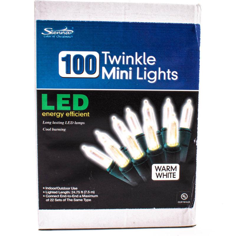 Description: Add a twinkle effect to your holiday lighting with these 100 warm white LED M5 mini twinkling lights. The bulbs are spaced 3 inches apart, and the green wire runs the total length of the lights, which is 27 feet.